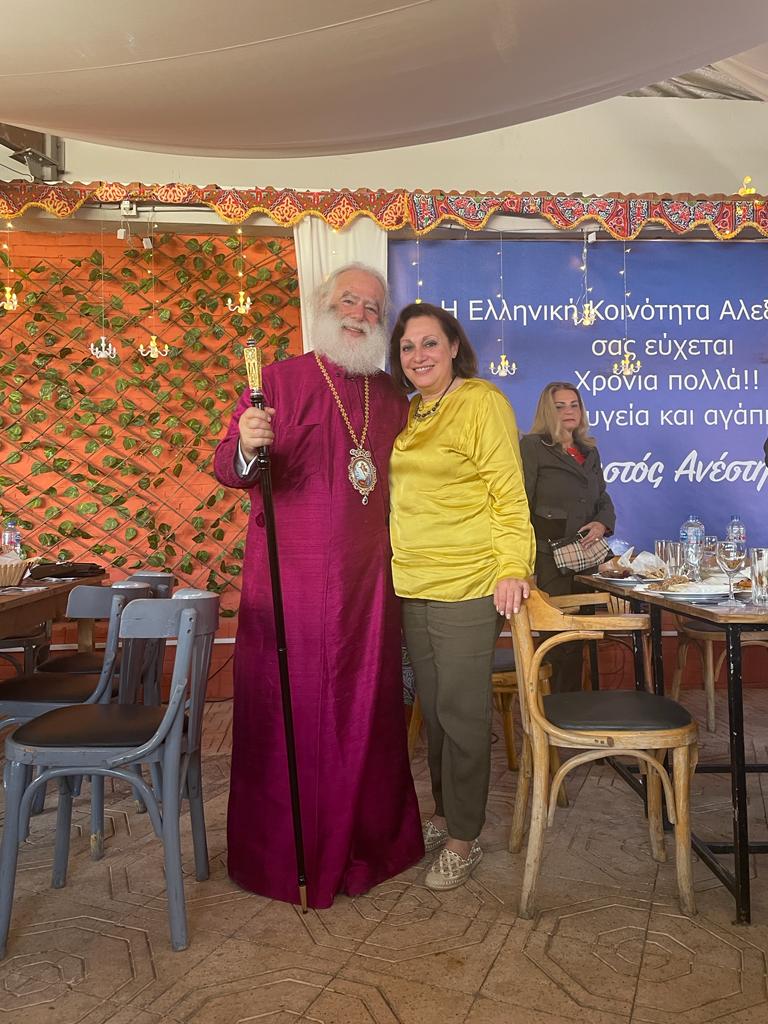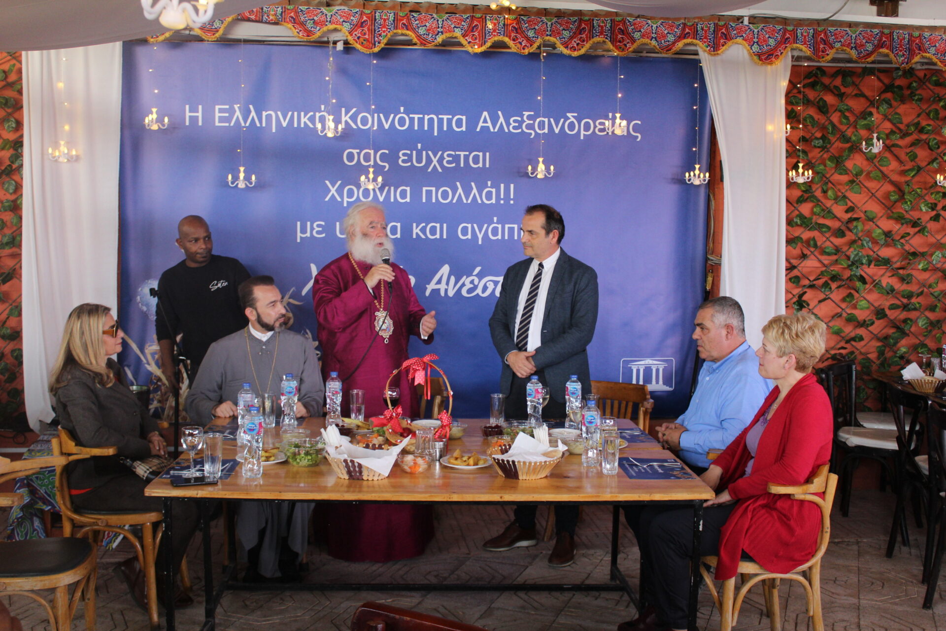 Ο Μακαριώτατος τίμησε για μια ακόμη φορά την Ελληνική Παροικία, συνοδευόμενος από τον Σεβασμιώτατο Μητροπολίτη Ναυκράτιδος κ. Παντελεήμονα, Αρχιγραμματέα της Ιεράς Συνόδου, τον Σεβασμιότατο Μητροπολίτη Ταμιάθεως κ. Γερμανό και τον Πανοσιολογιότατο Αρχιμανδρίτη κ. Ισαάκ, Σχολάρχη της Ιερατικής Σχολής του Πατριαρχείου, μαζί με μαθητές της ανωτέρω σχολής. Ο Πρόεδρος της Ελληνικής Κοινότητας Αλεξανδρείας κ. Ανδρέας Βαφειάδης, χαιρέτησε τους προσκεκλημένους, ευχήθηκε χρόνια πολλά με υγεία και δύναμη, και τόνισε την αναγκαιότητα ύπαρξης της Κοινότητας των Ελλήνων που αποτελεί μια ζωντανή ιστορία μέσα στο χρόνο.