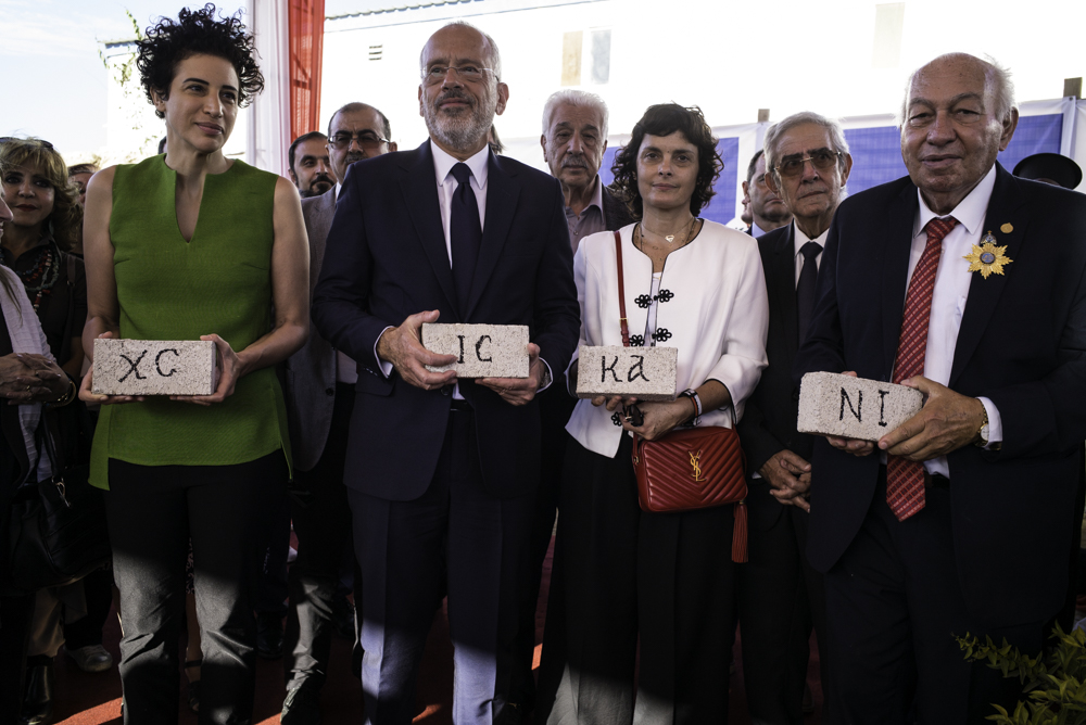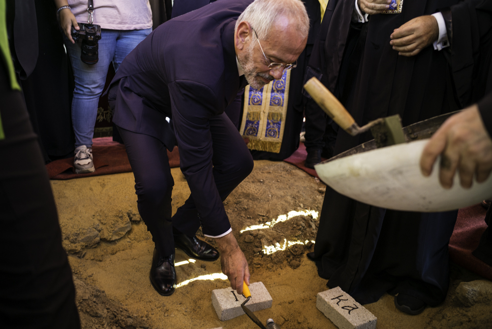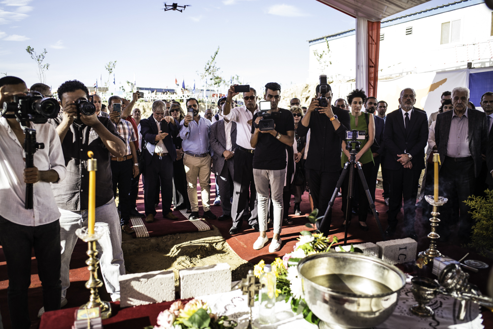 Η προσδοκώμενη στιγμή της θεμελίωσης του Ιερού Ναού είχε φθάσει, Έμπλεος συγκίνησης ο Μακαριώτατος προσεκάλεσε κοντά του, ακριβώς στο σημείο που στο μέλλον θα εδράζεται η Αγία Τράπεζα, τον Έλληνα Πρέσβη κ. Νικόλαο Παπαγεωργίου, την Πρέσβυ της Κυπριακής Δημοκρατίας κα. Πόλλυ Ιωάννου, την Γενική Πρόξενο στο Κάιρο κα. Δέσποινα Χασιρτζόγλου, τον Πρόεδρο της Ελληνικής Κοινότητας Αλεξανδρείας κ. Ανδρέα Βαφειάδη, την Αντιπρόεδρο της Ελληνικής Κοινότητας Καΐρου κα Χρυσάνθη Σκουφαρίδου και τον κ. Κλόντ Νακάς Πρόεδρο των Αραβόφωνων Ορθοδόξων. Άπαντες και άπασες έσφιξαν στα χέρια τους το μυστρί, θεμελιώνοντας με τους λίθους του παρόντος το έργο του μέλλοντος.