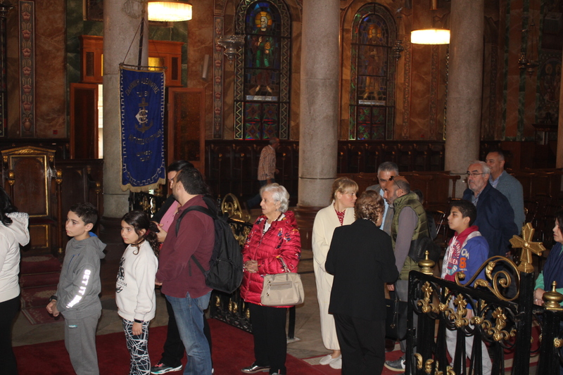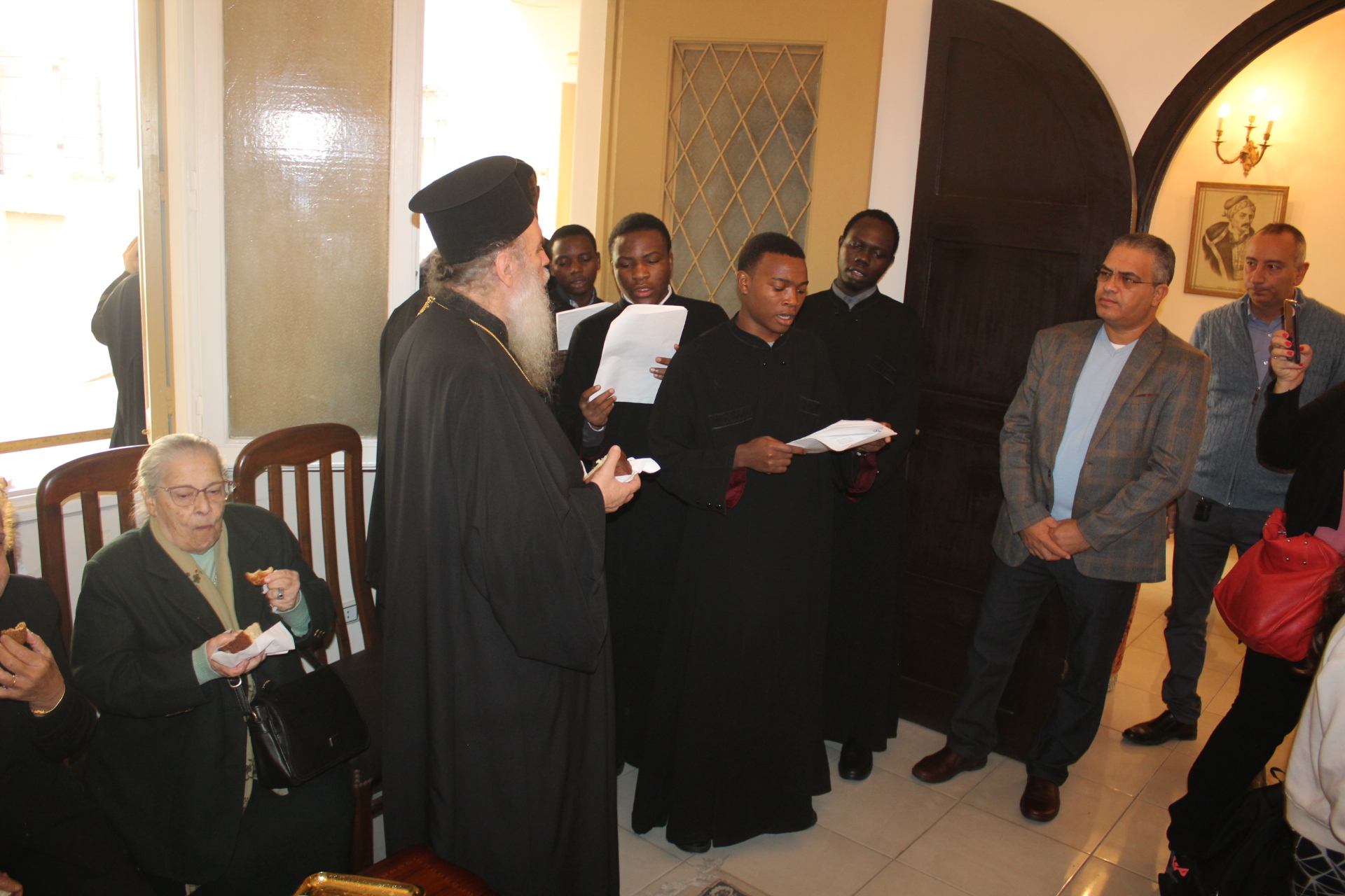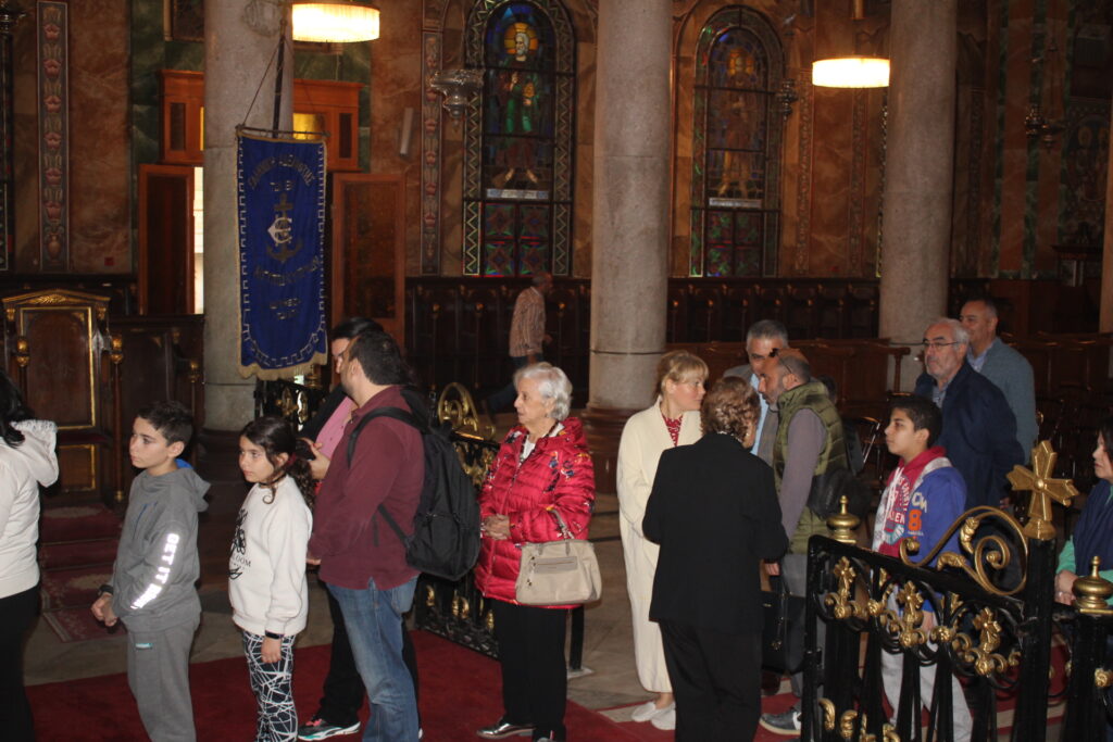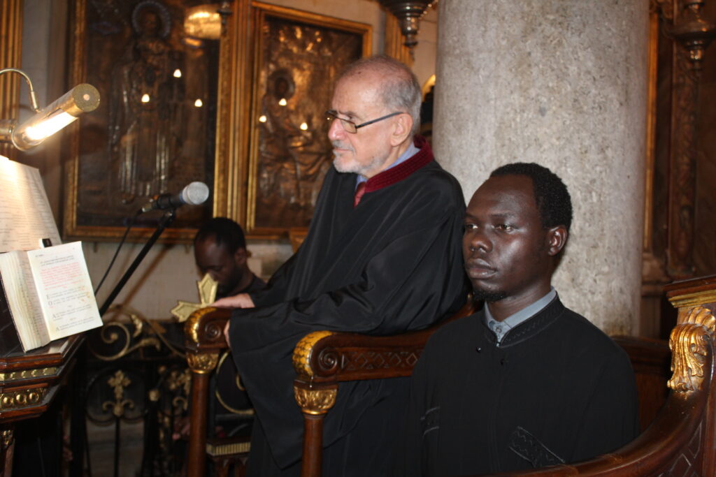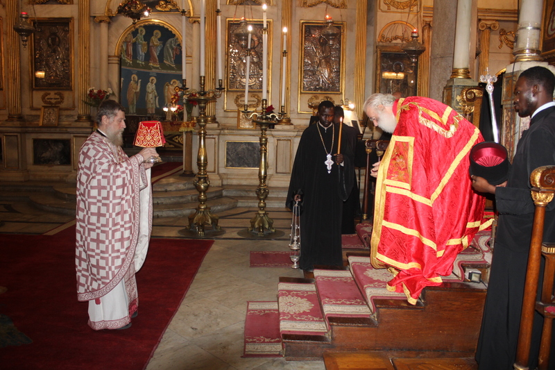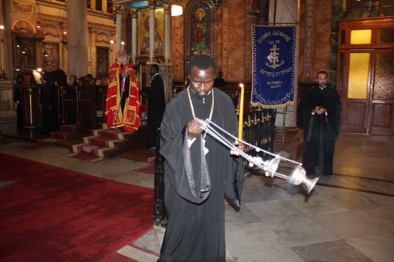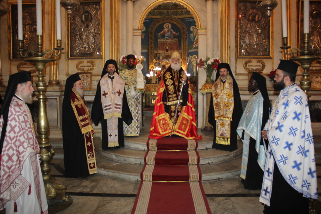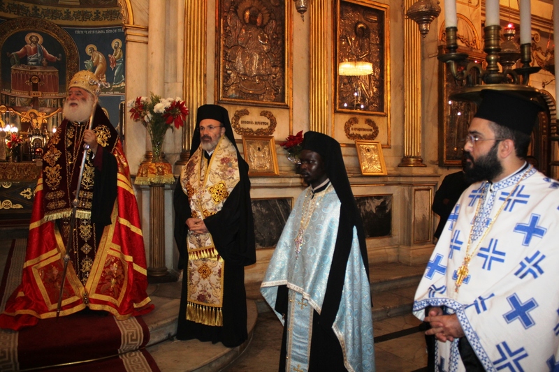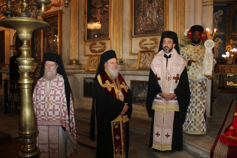 Συμπροσευχόμενοι με τον Μακαριώτατο, οι Σεβασμιότατοι Μητροπολίτες: Ναυκράτιδος κ. Παντελεήμων, Αρχιγραμματέας της Ιεράς Συνόδου, Πηλουσίου κ. Νάρκισσος, Πατριαρχικός Επίτροπος και Ταμιάθεως κ. Γερμανός Προϊστάμενος της Ιεράς Μονής του Οσίου Σάββα του Ηγιασμένου. Λειτουργός ο Πανοσιολογιότατος Αρχιμανδρίτης κ. Ισαάκ, Σχολάρχης της Πατριαρχικής Σχολής, ο ιερέας Φέντι ενώ στο ψαλτήρι με τις βυζαντινές νότες των Ευαγγελίων εναρμονιζόταν ο ιεροψάλτης κ. Αλέξανδρος Μπάσης συνάμα εκπαιδευτικός, με την αρωγή του Σεβασμιωτάτου Γερμανού και των μαθητών της Ιερατικής Σχολής.
