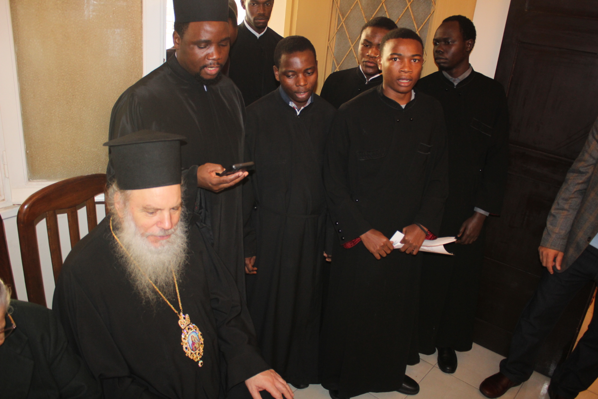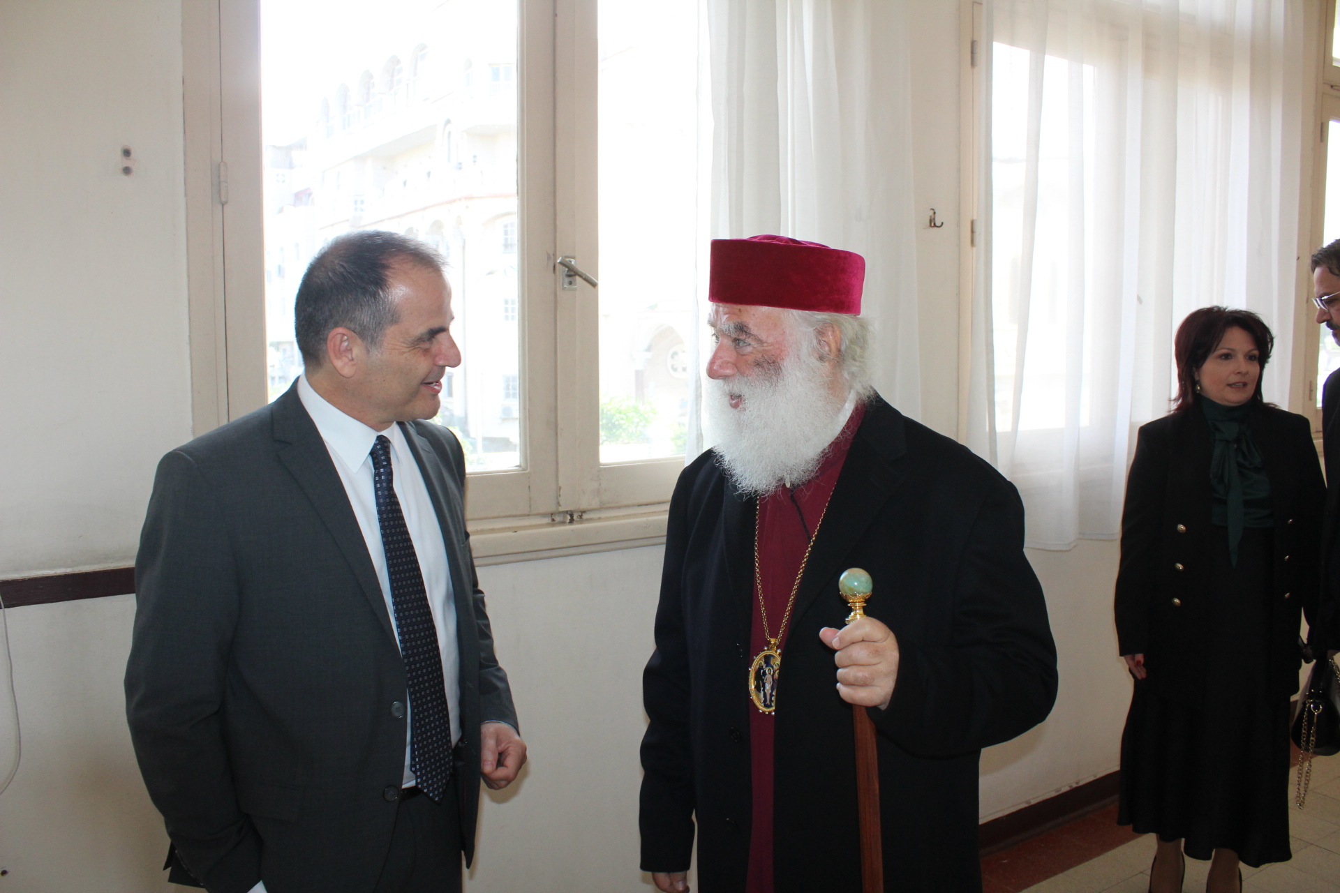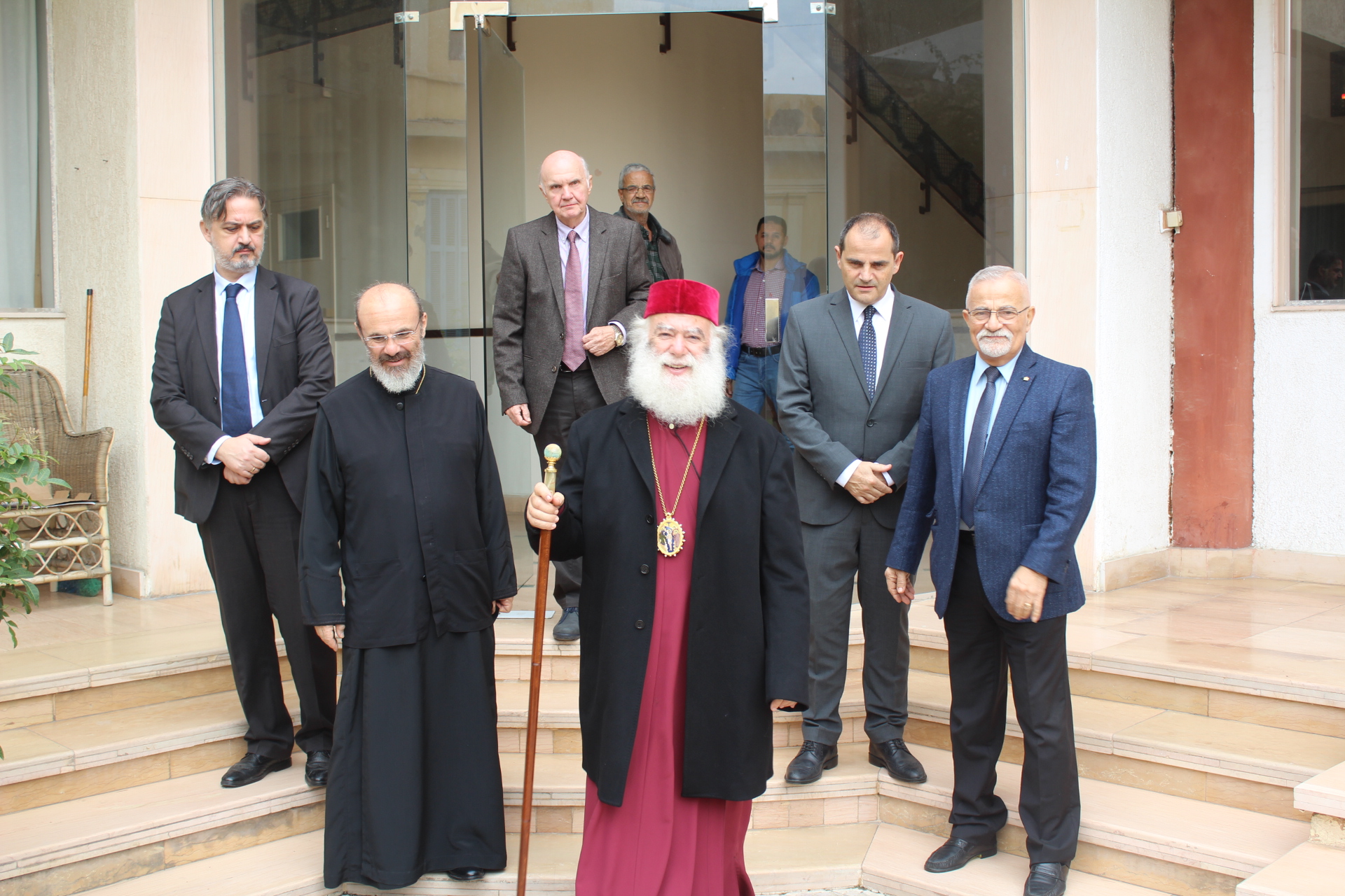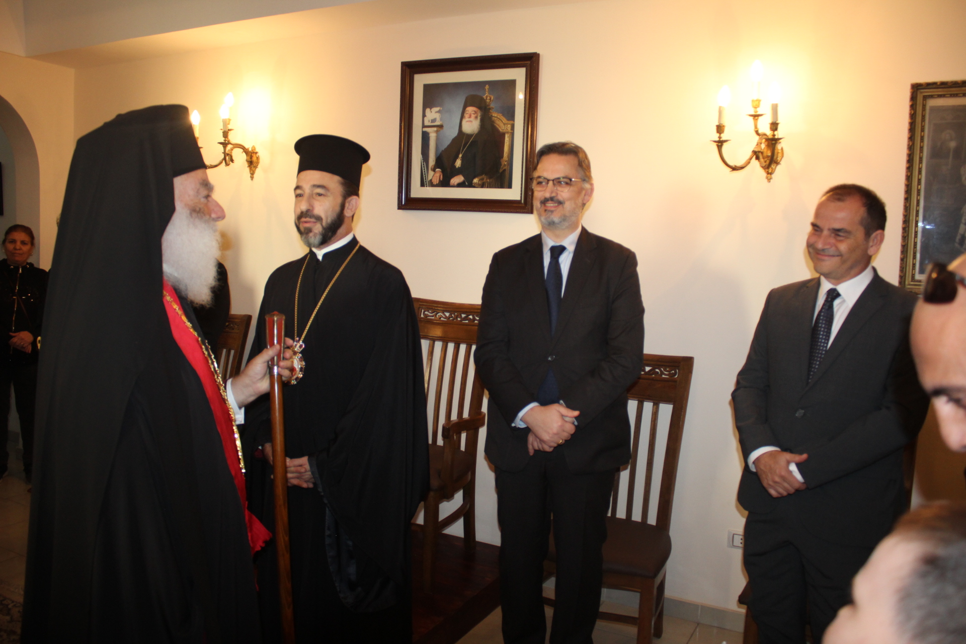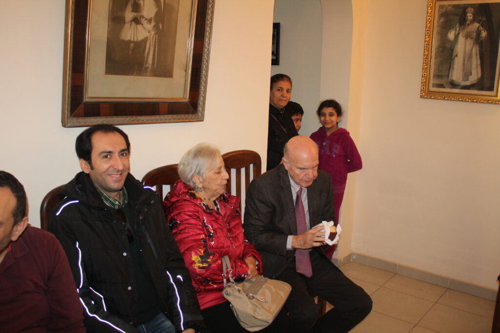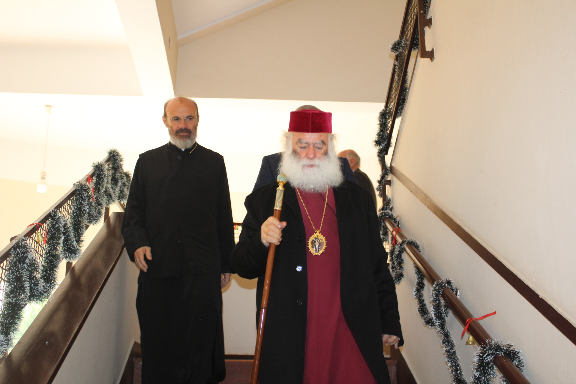 Συμπροσευχόμενοι με τον Μακαριώτατο, οι Σεβασμιότατοι Μητροπολίτες: Ναυκράτιδος κ. Παντελεήμων, Αρχιγραμματέας της Ιεράς Συνόδου, Πηλουσίου κ. Νάρκισσος, Πατριαρχικός Επίτροπος και Ταμιάθεως κ. Γερμανός Προϊστάμενος της Ιεράς Μονής του Οσίου Σάββα του Ηγιασμένου. Λειτουργός ο Πανοσιολογιότατος Αρχιμανδρίτης κ. Ισαάκ, Σχολάρχης της Πατριαρχικής Σχολής, ο ιερέας Φέντι ενώ στο ψαλτήρι με τις βυζαντινές νότες των Ευαγγελίων εναρμονιζόταν ο ιεροψάλτης κ. Αλέξανδρος Μπάσης συνάμα εκπαιδευτικός, με την αρωγή του Σεβασμιωτάτου Γερμανού και των μαθητών της Ιερατικής Σχολής.