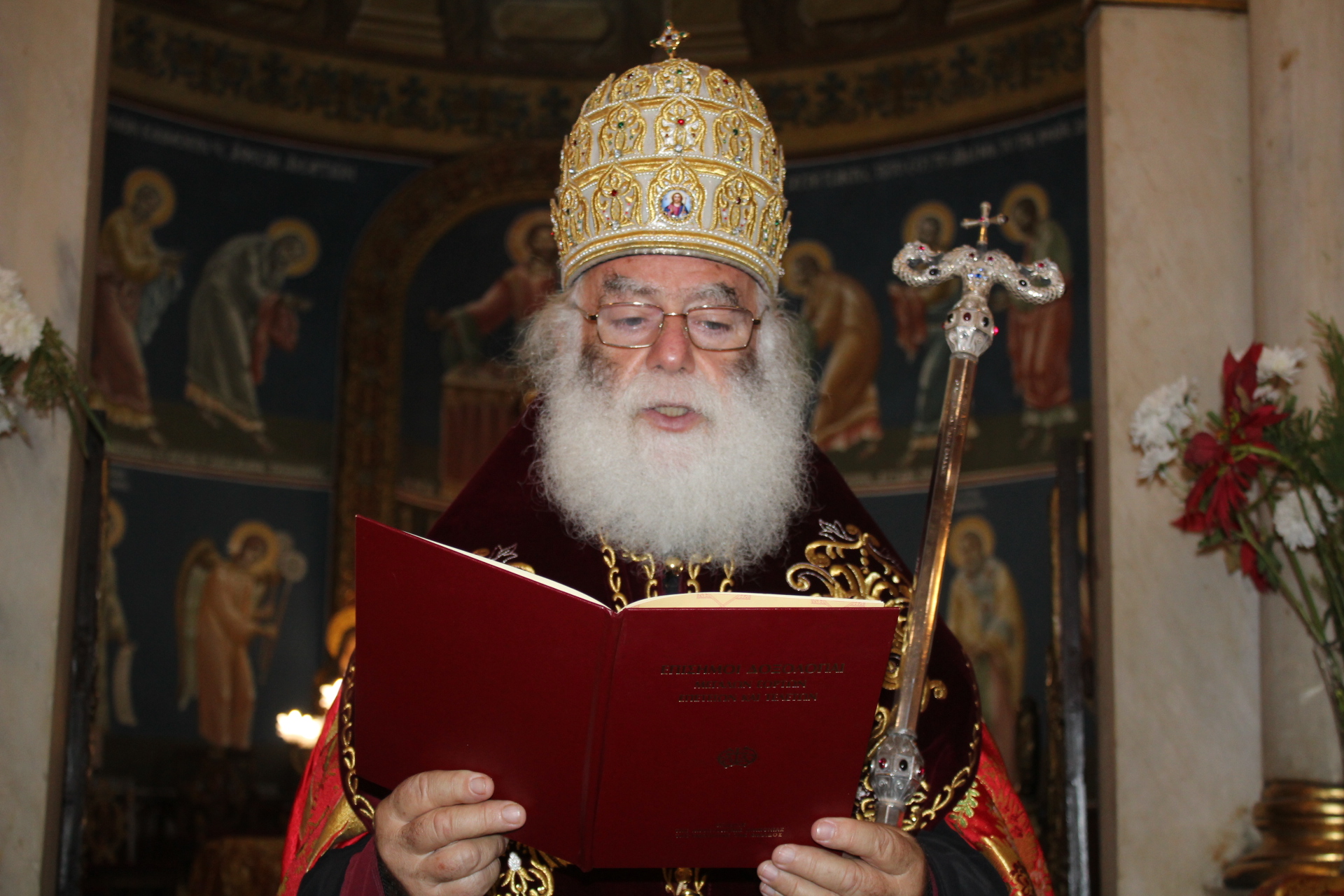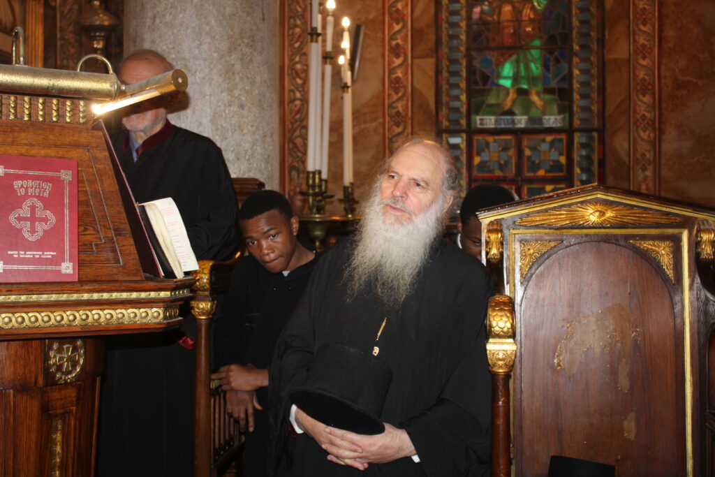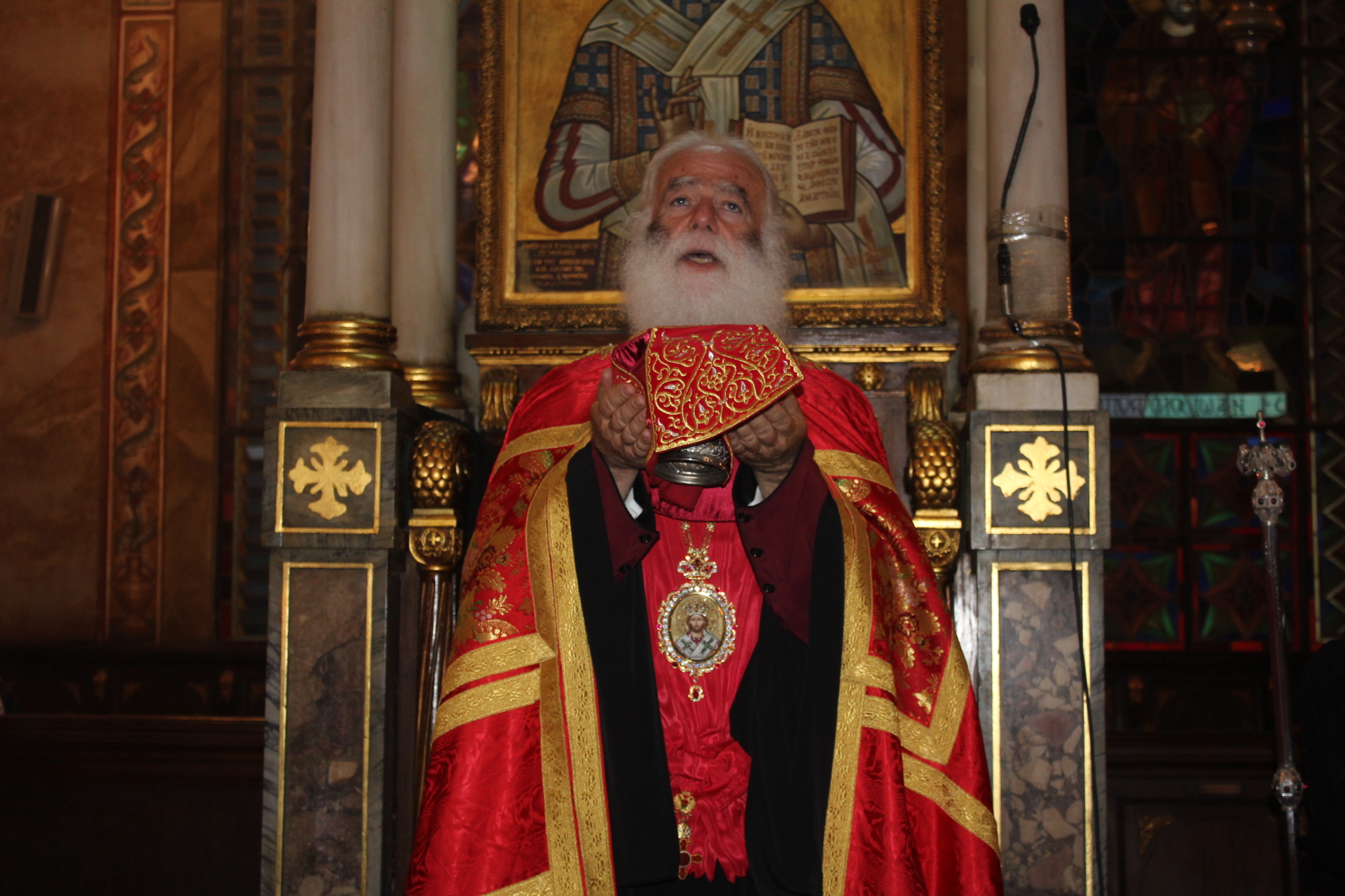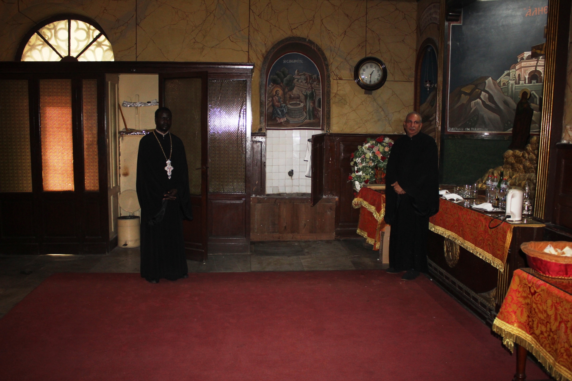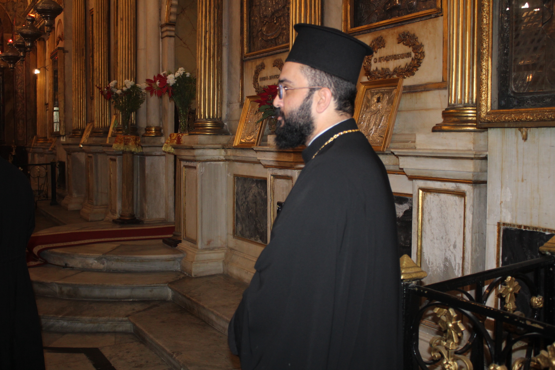 Συμπροσευχόμενοι με τον Μακαριώτατο, οι Σεβασμιότατοι Μητροπολίτες: Ναυκράτιδος κ. Παντελεήμων, Αρχιγραμματέας της Ιεράς Συνόδου, Πηλουσίου κ. Νάρκισσος, Πατριαρχικός Επίτροπος και Ταμιάθεως κ. Γερμανός Προϊστάμενος της Ιεράς Μονής του Οσίου Σάββα του Ηγιασμένου. Λειτουργός ο Πανοσιολογιότατος Αρχιμανδρίτης κ. Ισαάκ, Σχολάρχης της Πατριαρχικής Σχολής, ο ιερέας Φέντι ενώ στο ψαλτήρι με τις βυζαντινές νότες των Ευαγγελίων εναρμονιζόταν ο ιεροψάλτης κ. Αλέξανδρος Μπάσης συνάμα εκπαιδευτικός, με την αρωγή του Σεβασμιωτάτου Γερμανού και των μαθητών της Ιερατικής Σχολής.
