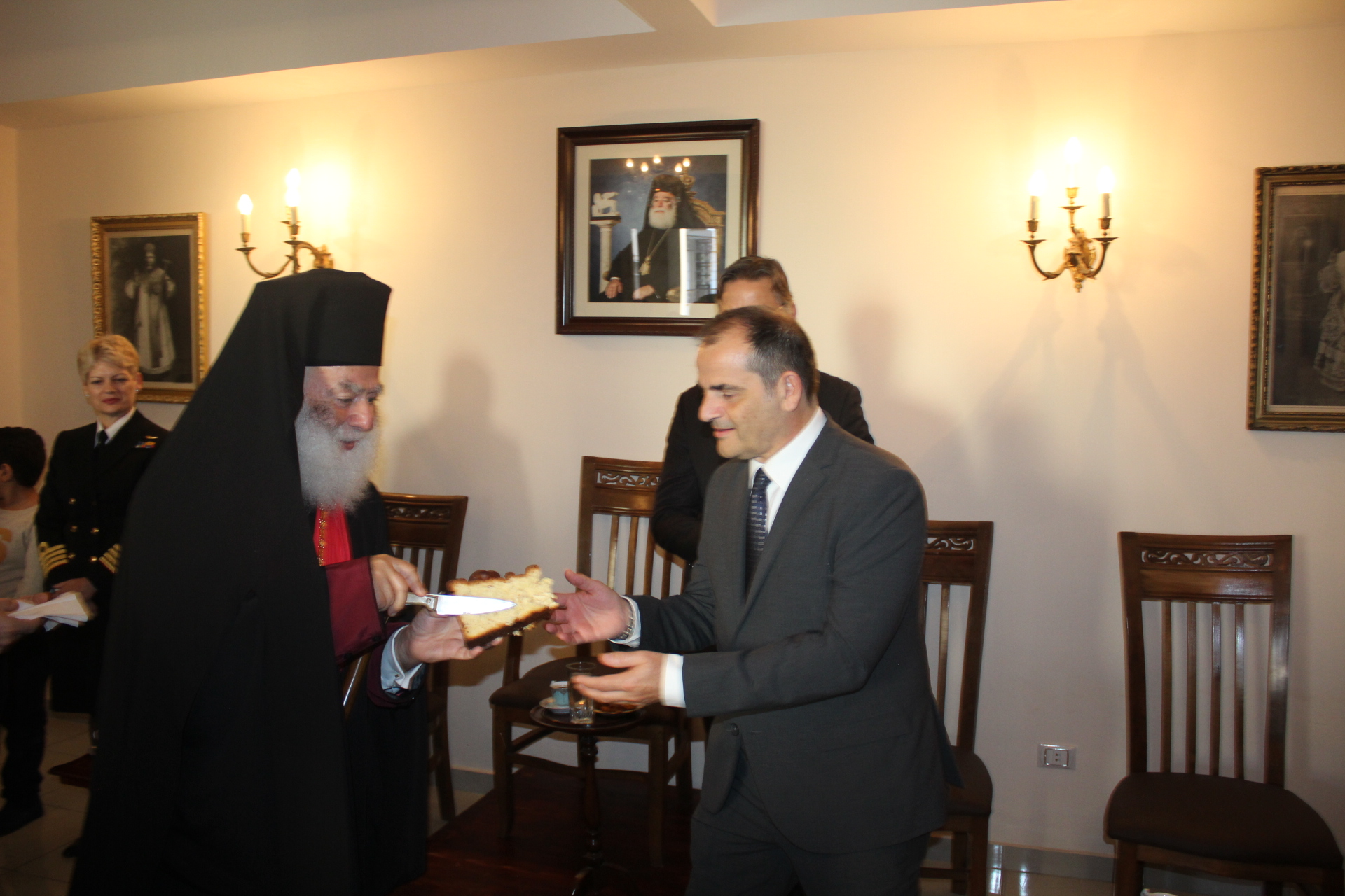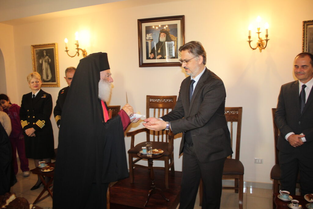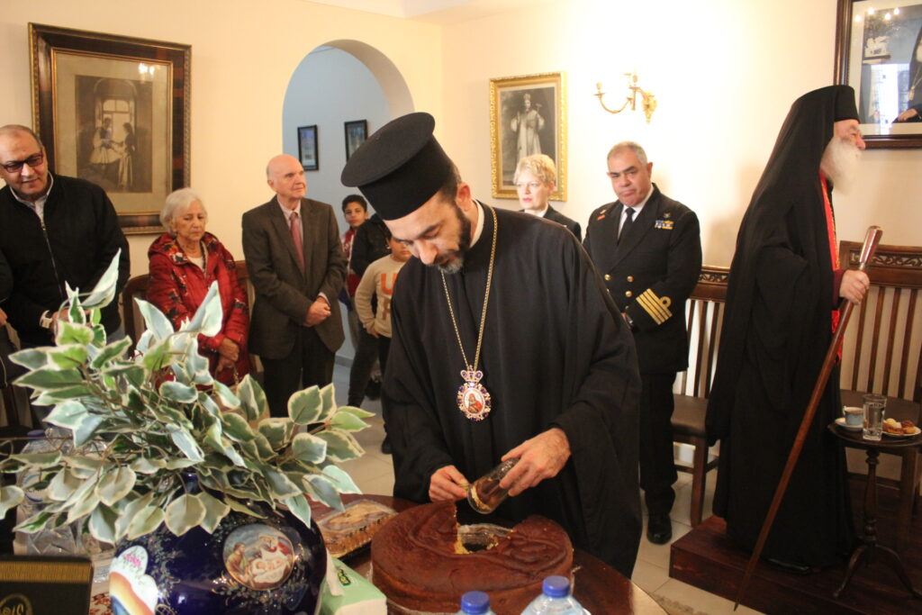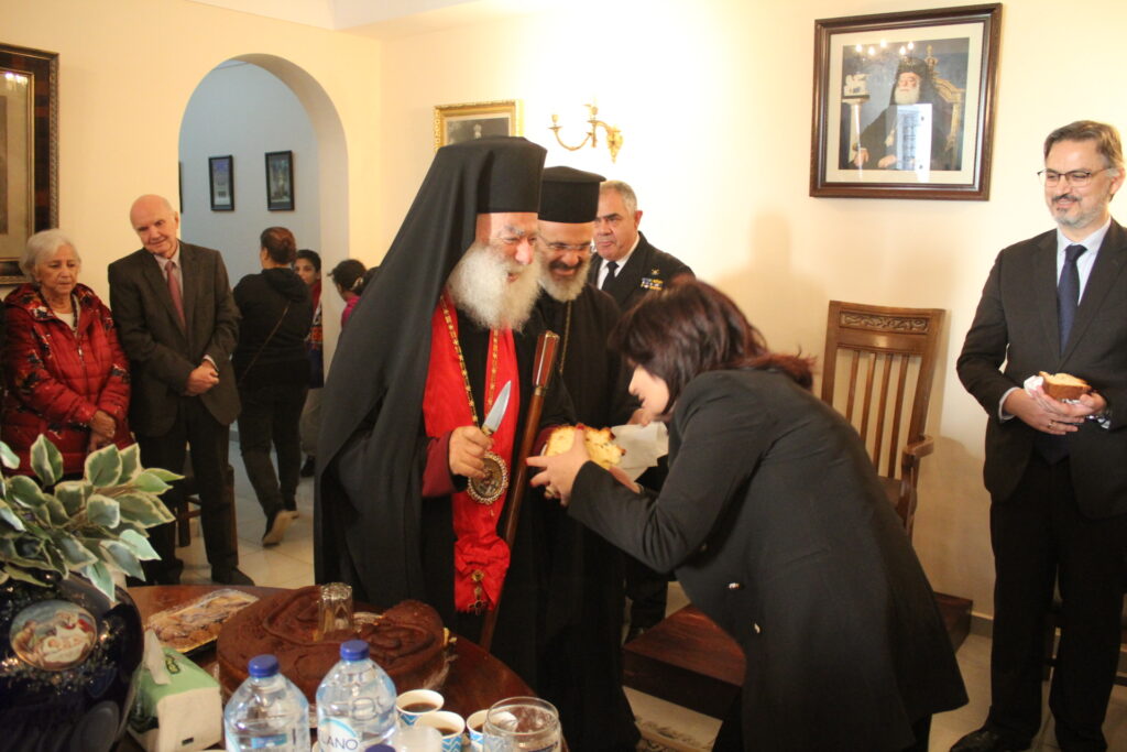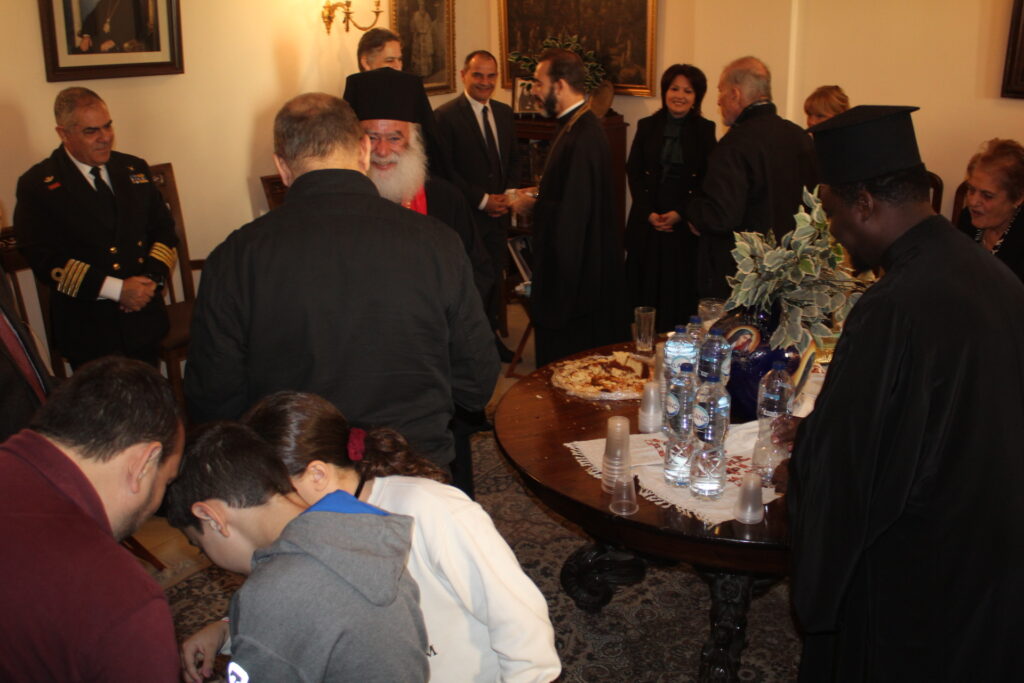 Μετά το αντίδωρο που μοίρασε ο Μακαριότατος και στη συνέχεια οι Αρχιερείς του, οδηγήθηκαν άπαντες στο Αρχονταρίκι του Ναού όπου εκεί ο Πατριάρχης ευλόγησε την Πίτα της Ελληνικής Κοινότητας και απευθυνόμενος στον Πρόεδρο της ΕΚΑ κ. Ανδρέα Βαφειάδη του ζήτησε να την κόψει ευχόμενος προς αυτόν υγεία, ευημερία και επιτυχίες.