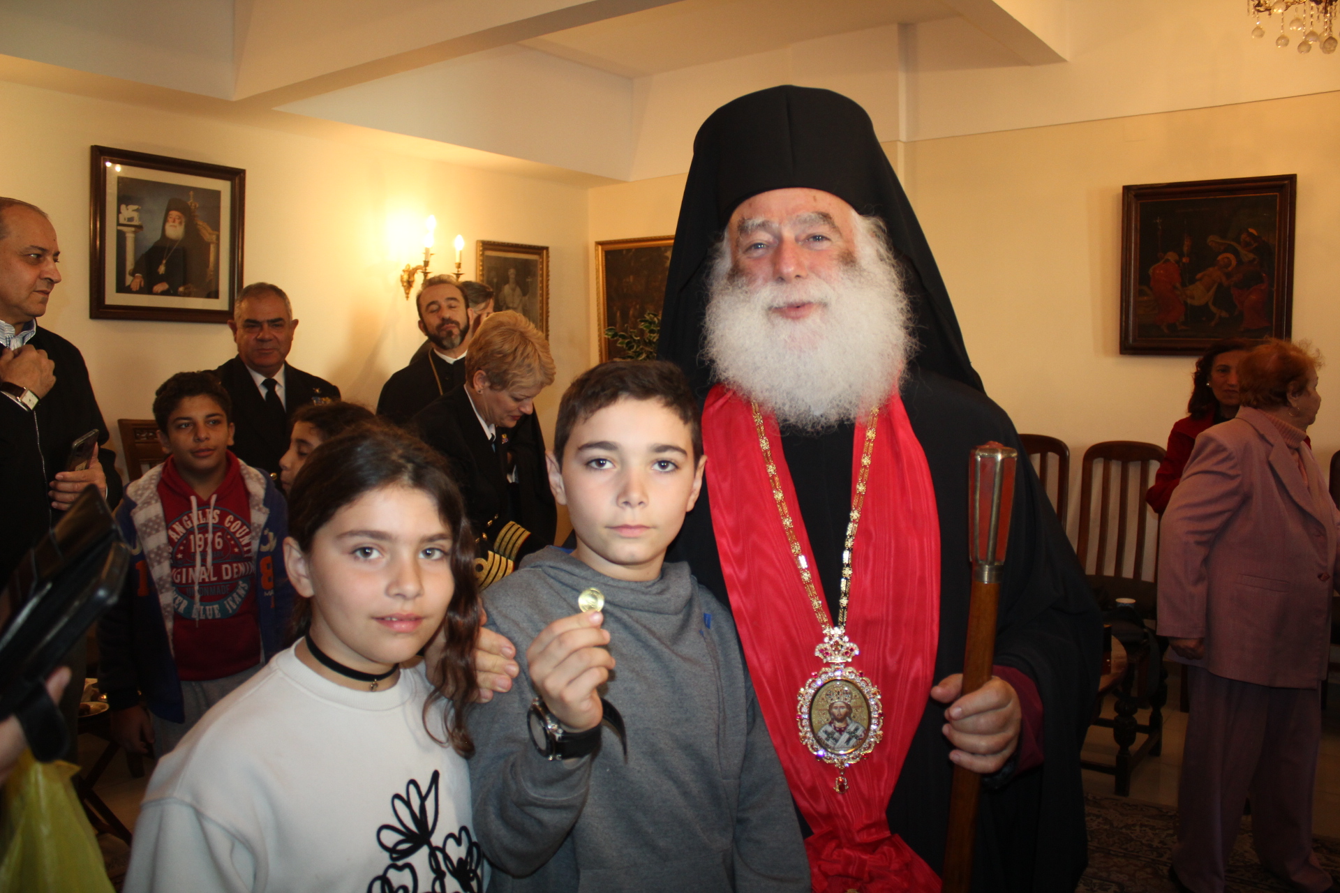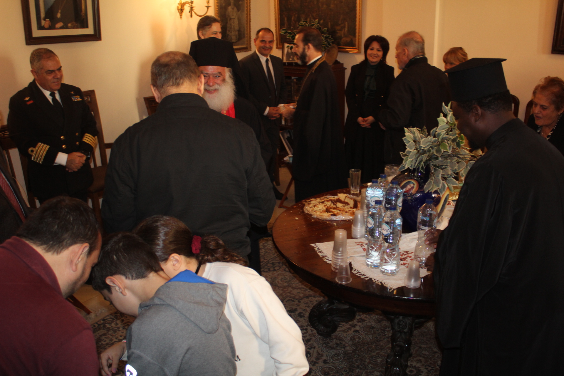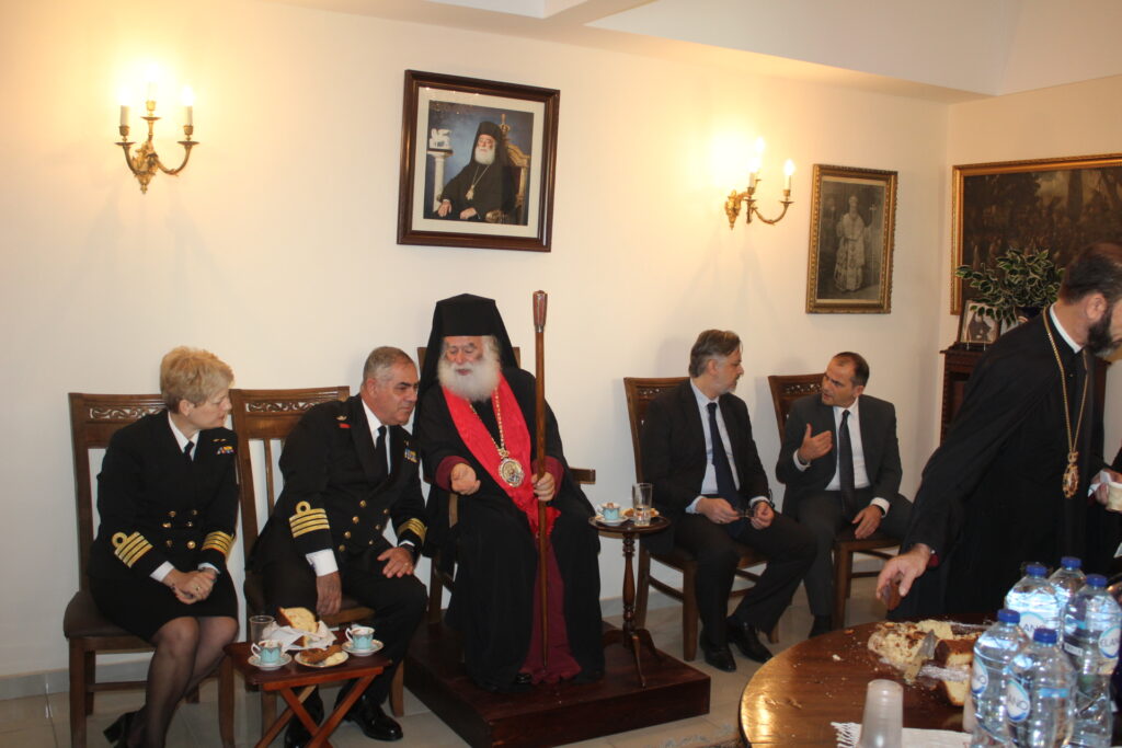 Μετά το αντίδωρο που μοίρασε ο Μακαριότατος και στη συνέχεια οι Αρχιερείς του, οδηγήθηκαν άπαντες στο Αρχονταρίκι του Ναού όπου εκεί ο Πατριάρχης ευλόγησε την Πίτα της Ελληνικής Κοινότητας και απευθυνόμενος στον Πρόεδρο της ΕΚΑ κ. Ανδρέα Βαφειάδη του ζήτησε να την κόψει ευχόμενος προς αυτόν υγεία, ευημερία και επιτυχίες.