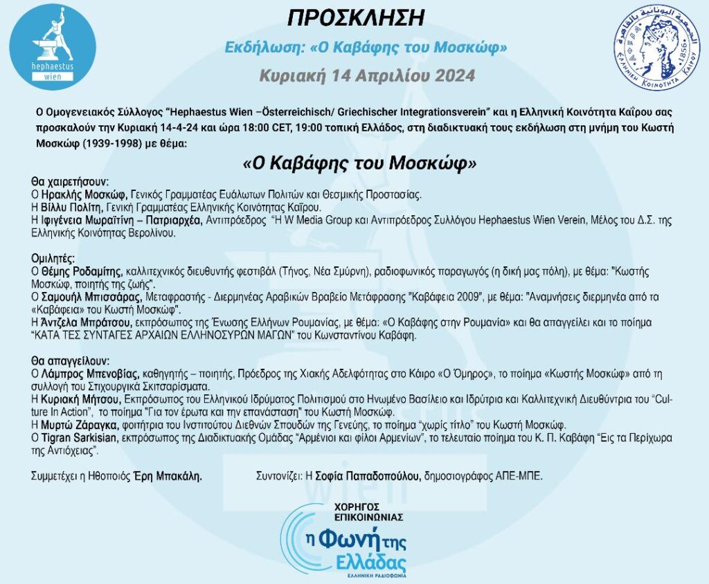 Μια ενδιαφέρουσα εκδήλωση την Κυριακή 14 Απριλίου 2024, με τίτλο “Ο Καβάφης του Μοσκώφ” με Χορηγό Επικοινωνίας τη “Φωνή της Ελλάδας”