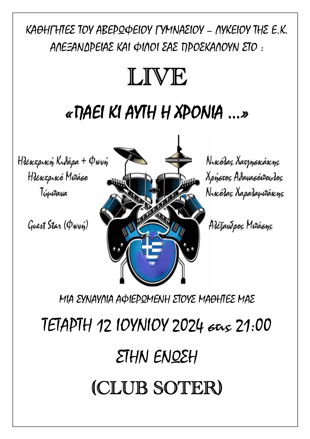 Καλή επιτυχία στους συντελεστές και καλή διασκέδαση σε όσους παρευρεθούν στο αποχαιρετιστήριο live των αγαπητών εκπαιδευτικών μας!