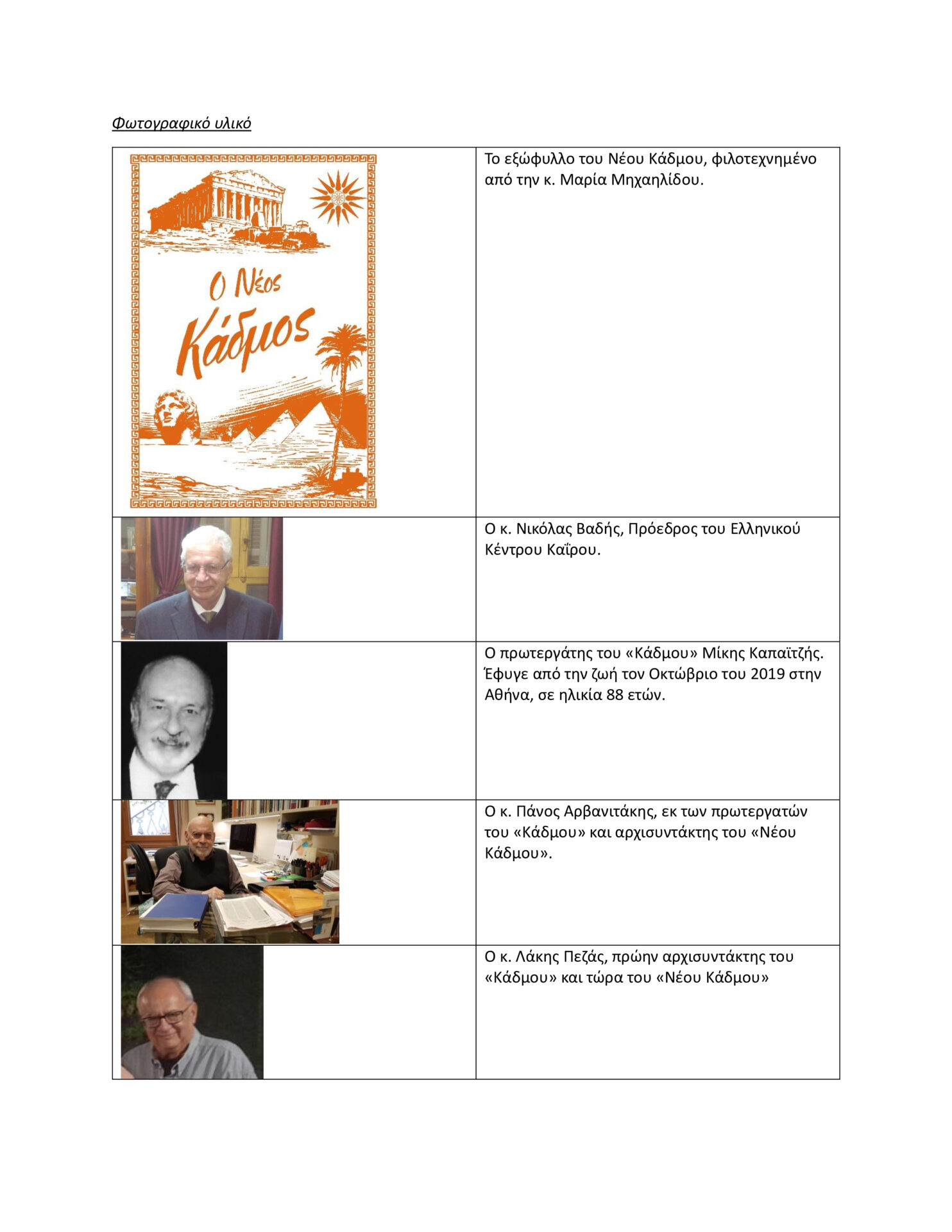Το 1947, με πρωτεργάτες δύο τότε μαθητές της Αμπετείου Σχολής, τον Μίκη Καπαϊτζή (ο οποίος δεν είναι πλέον εν ζωή) και τον Πάνο Αρβανιτάκη, ξεκίνησε η έκδοση του περιοδικού «Κάδμος». Η προσπάθεια στέφθηκε με επιτυχία καθώς η τότε Διοίκηση της Σχολής και ο Σύλλογος των διδασκόντων αγκάλιασαν την προσπάθεια και υπήρξαν αρωγοί. Τα άρθρα έγραφαν κυρίως μαθητές και μαθήτριες της Σχολής. Με την κατά κύματα φυγή των Αιγυπτιωτών Ελλήνων από την Νειλοχώρα την δεκαετία του ’60 σταμάτησε η έκδοση. Αργότερα κάποιοι απόφοιτοι της Αμπετείου στην Αθήνα αποφάσισαν να συνεχίσουν την έκδοση. Το 2018, ο Πρόεδρος του Ιδρύματος Αμπετείου Σχολής Καΐρου, ο Αρχιεπίσκοπος Σινά, Φαράν και Ραϊθώ, κ. Δαμιανός, αποφάσισε να αναλάβει η Σχολή την συνέχιση της έκδοσης του περιοδικού «Κάδμος». Τότε, όντας καθηγητής της Αμπετείου, μου ζητήθηκε να γίνω μέλος της συντακτικής επιτροπής υπό την αρχισυνταξία του Αιγυπτιώτη κ. Λάκη Πεζά, ο οποίος διαμένει στην Αθήνα. Αφού εκδόθηκαν 3 τεύχη υπό την σκέπη της Αμπετείου Σχολής, αιφνιδίως, ο Αρχιεπίσκοπος αποφάσισε την αναστολή της έκδοσης, πράγμα που στενοχώρησε πολλούς Αμπετειανούς. Ο εκ των πρωτεργατών του «Κάδμου», κ. Πάνος Αρβανιτάκης, ο οποίος ζει στο Λονδίνο, κινητοποιήθηκε για να συνεχισθεί να εκδίδεται το περιοδικό. Μετά από σειρά συζητήσεων, ο κ. Νικόλας Βαδής, Πρόεδρος του Ελληνικού Κέντρου Καΐρου (επί της πλατείας Τάλαατ Χαρμπ στο Κάιρο), προέβη στις απαραίτητες ενέργειες, ώστε το Ελληνικό Κέντρο να αναλάβει την έκδοση ηλεκτρονικού περιοδικού με την επωνυμία «ο Νέος Κάδμος» και αρχισυντάκτες τους κ. Πάνο Αρβανιτάκη και Λάκη Πεζά. Ταυτόχρονα δημιουργήθηκε ιστοσελίδα, στην οποία αναρτώνται όλα τα τεύχη του «Νέου Κάδμου», ενώ καταβάλλεται προσπάθεια να αναρτηθούν και τεύχη του αρχικού περιοδικού. Το πρώτο τεύχος του «Νέου Κάδμου» εκδόθηκε τον Φεβρουάριο του 2023 και έχουν εκδοθεί συνολικά 5 τεύχη μέχρι σήμερα με μέσο όρο σελίδων πάνω από 60 ανά τεύχος. Το περιοδικό αποστέλλεται ηλεκτρονικά, δωρεάν.