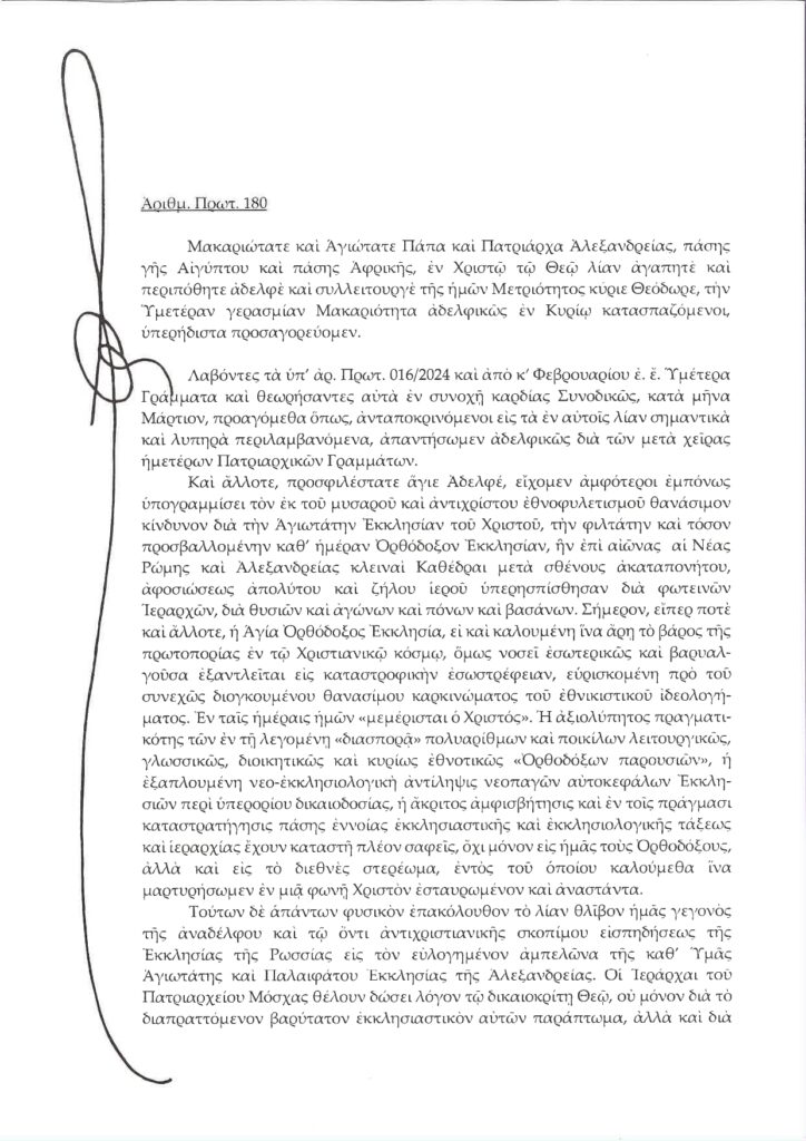 Βαρυσήμαντο Γράμμα του Οικουμενικού Πατριάρχη προς τον Αλεξανδρείας Θεόδωρο