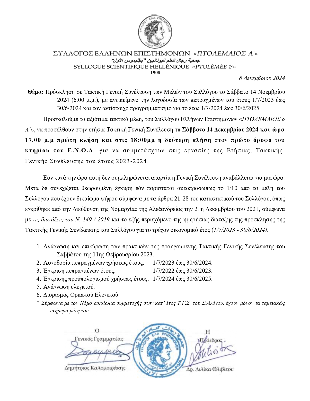 Προσκαλούμε τα αξιότιμα τακτικά μέλη, του Συλλόγου Ελλήνων Επιστημόνων «ΠΤΟΛΕΜΑΙΟΣ ο Α΄», να προσέλθουν στην ετήσια Τακτική Γενική Συνέλευση το Σάββατο 14 Δεκεμβρίου 2024 και ώρα