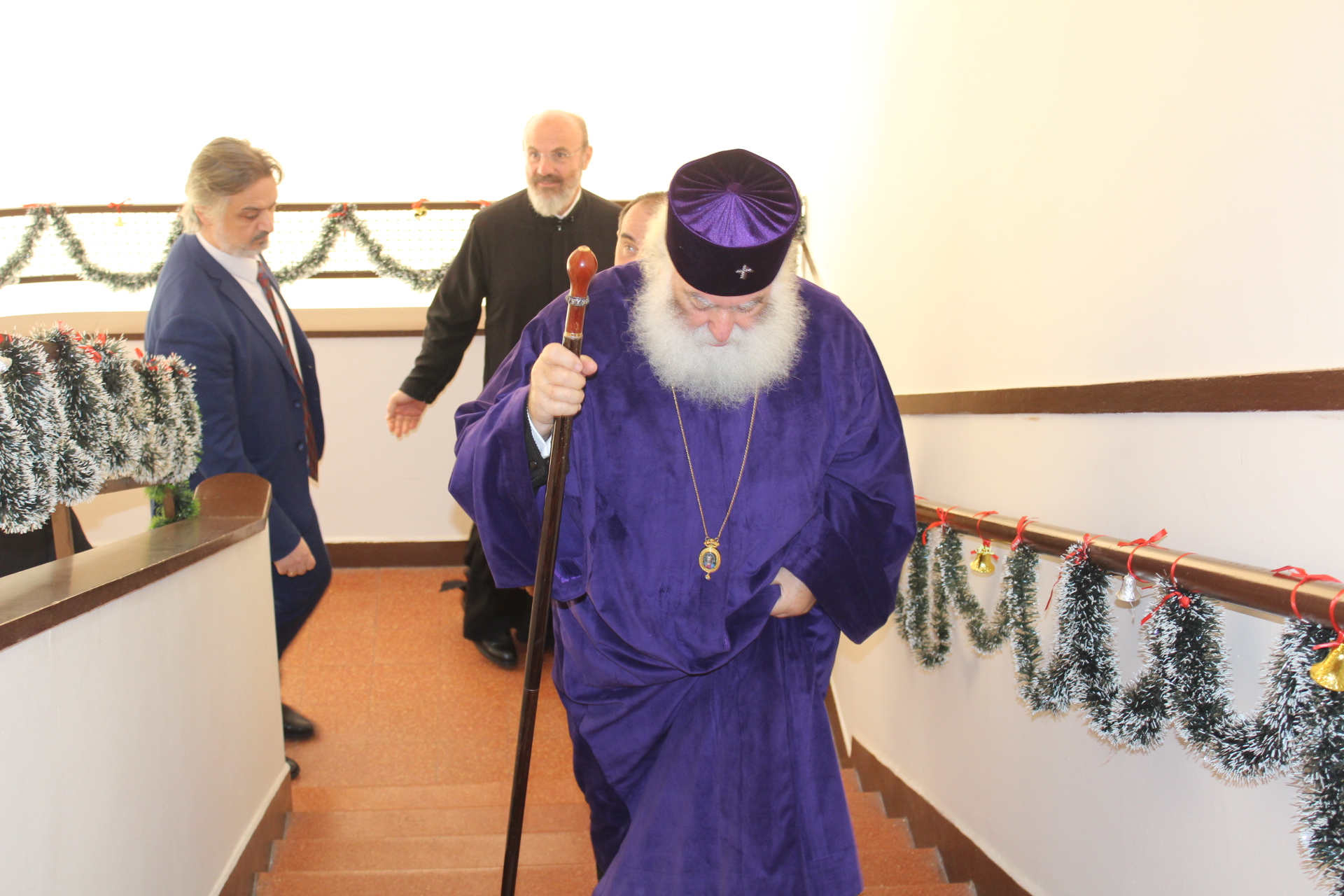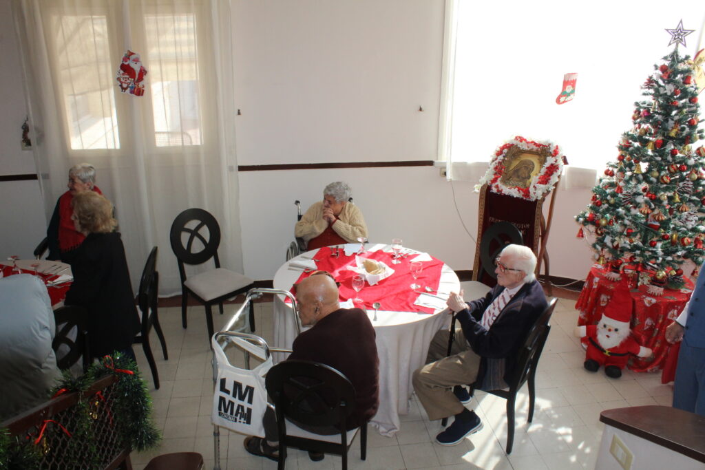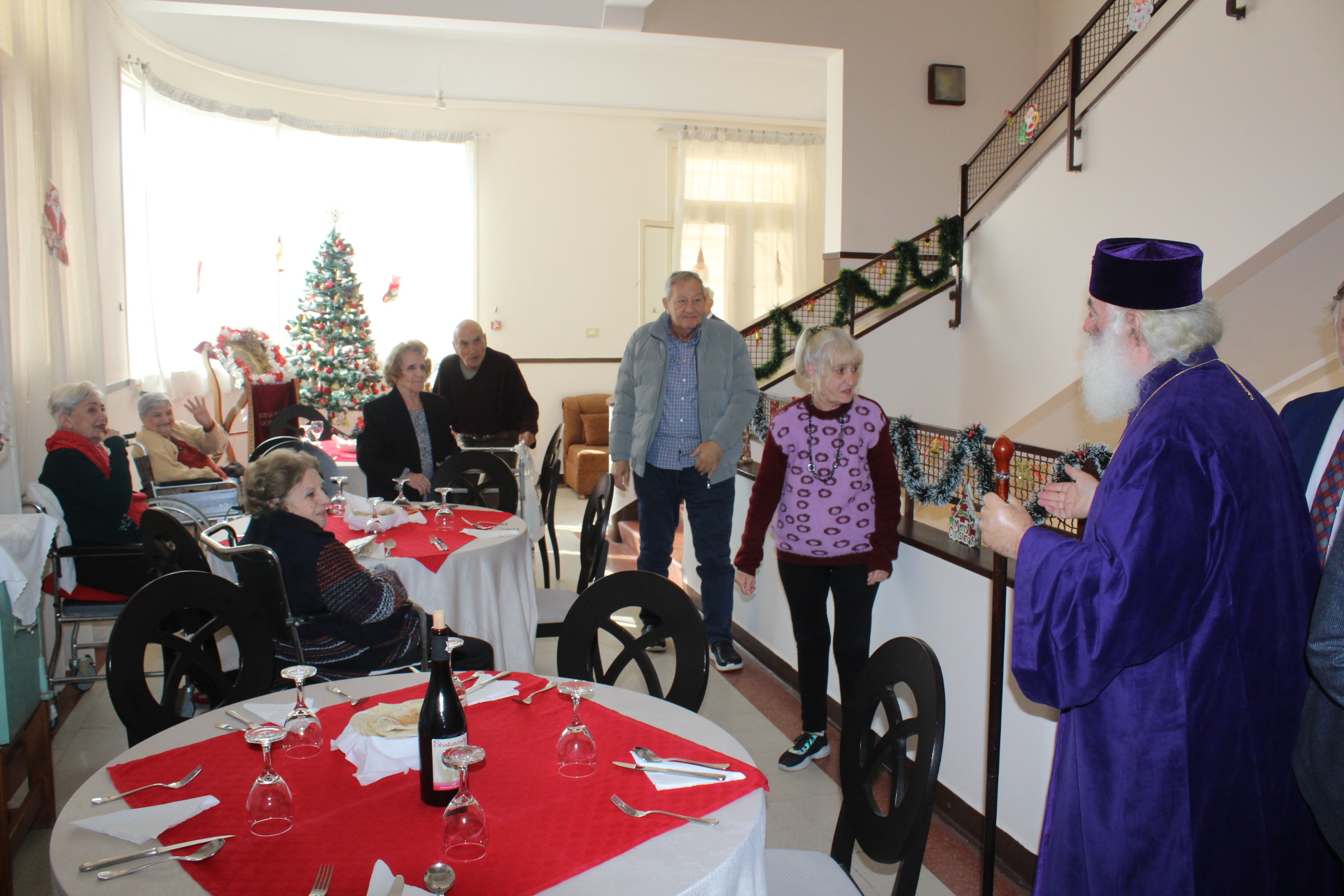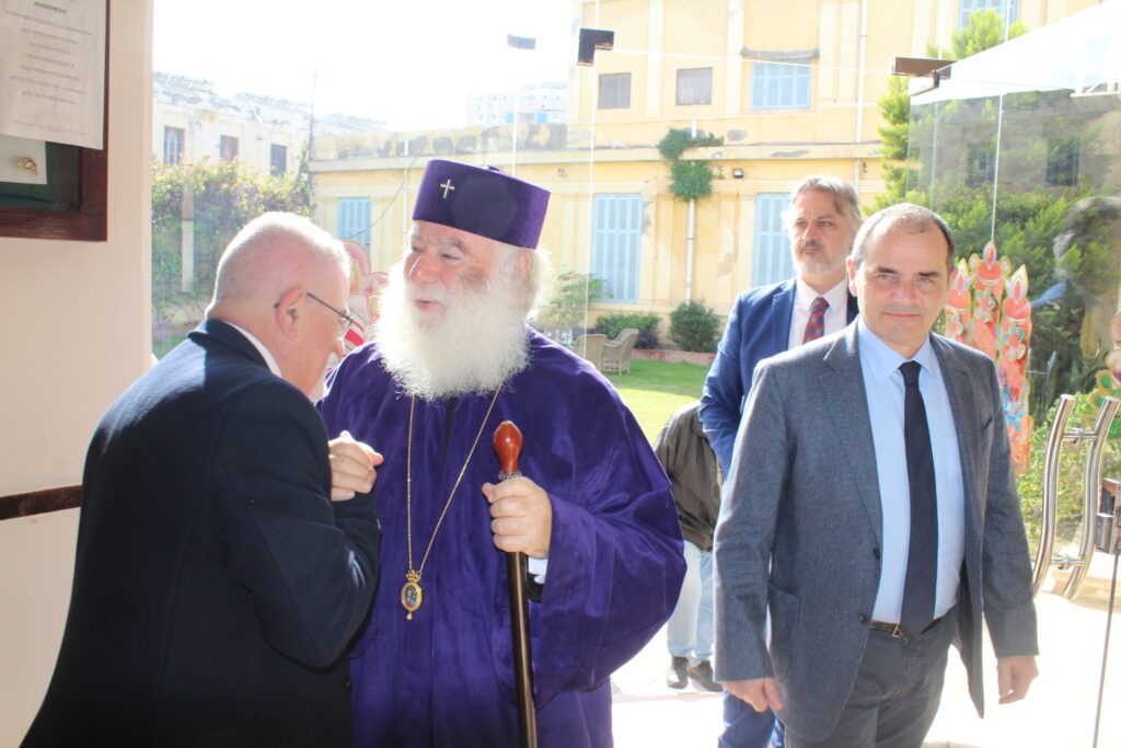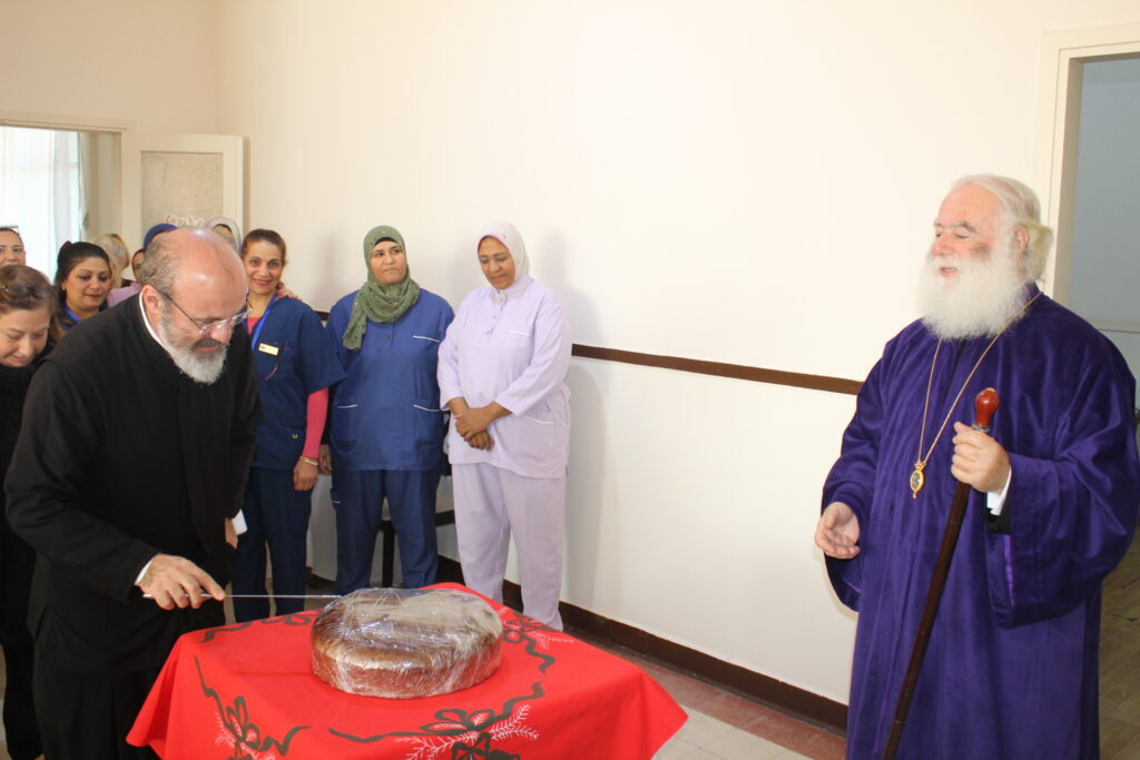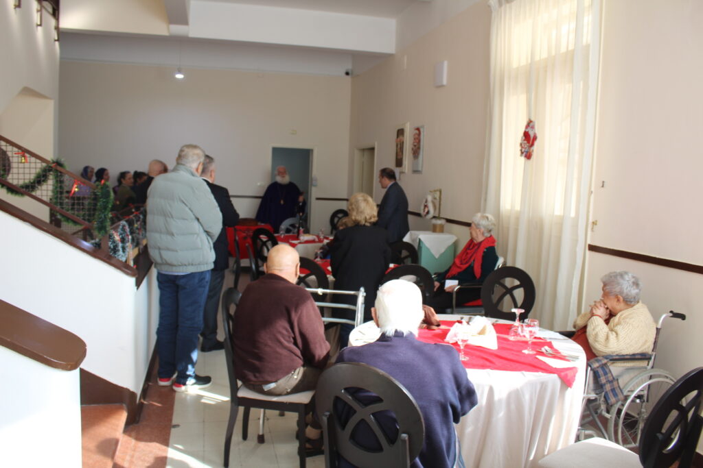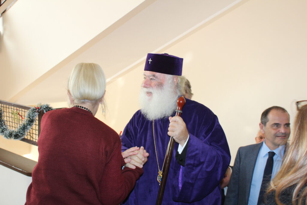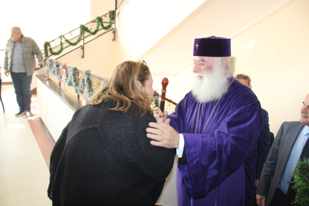 Όλοι μαζί ανέβηκαν στον Οίκο Ευγηρίας για να γευματίσουν μαζί με τους τροφίμους και το προσωπικό. Η Διευθύντρια του ΜΑΝΝΑ κα Αγγελική Νιάρου επί της υποδοχής μαζί με τον ιατρό κ. Μέτχαντ Σόκαρ, το προσωπικό και τους τροφίμους που είχαν πάρει τη θέση τους στα τραπέζια, πήραν την ευλογία του Μακαριωτάτου και στη συνέχεια ο Ιεράρχης της Ορθοδοξίας επισκέφθηκε όλους τους θαλάμους για να χαιρετήσει τους πλέον αδύναμους ηλικιωμένους που αδυνατούσαν να καθίσουν στο σαλόνι.