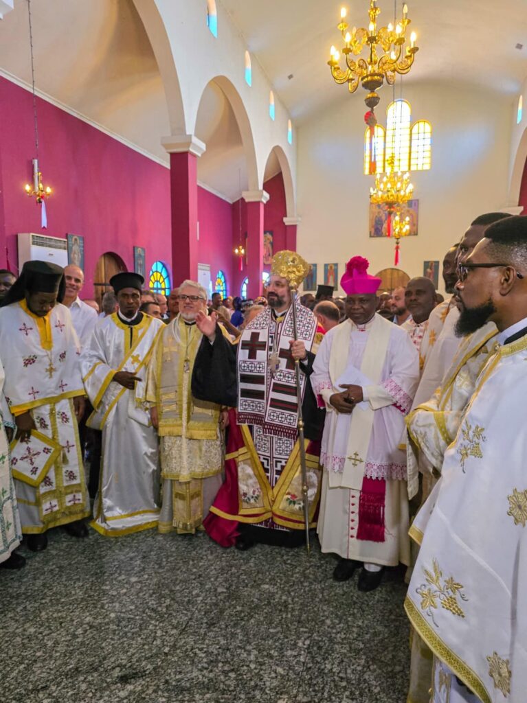 Του Αρχιερατικού Συλλείτουργου προέστη ο εκπρόσωπος του Μακαριωτάτου Πατριάρχου, Μητροπολίτης Γουινέας κ. Γεώργιος, συλλειτουργούντων του Σεβασμιωτάτου Μητροπολίτου Νιγηρίας κ. Νικοδήμου και όλων των κληρικών της Μητροπόλεως, συμπροσευχομένων πλήθους πιστών, οι οποίοι προσήλθαν για να δηλώσουν την χαρά τους αλλά και την αμέριστη αγάπη τους προς το νέο Ποιμενάρχη τους.
