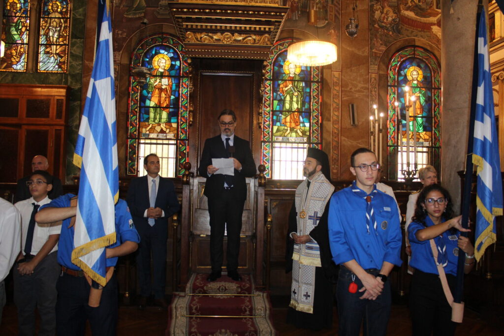 Από νωρίς τα Λυκόπουλα, οι Πρόσκοποι και οι μαθητές των Σχολείων της Ελληνικής Κοινότητας είχαν πάρει τις θέσεις τους έξωθεν του Ιερού Ναού και στη συνέχεια με τάξη και σεβασμό προς το κλέος της ημέρας, παρατάχθηκαν με τις σημαίες σχηματίζοντας ένα διάδρομο. Κι όταν εδόθη το σήμα απ΄ τον Έφορο Διοίκησης κ. Άρη Μαρκοζάνη τα εμβλήματα του έθνους έγειραν στα χέρια των σημαιοφόρων και απεικόνισαν την τιμή προς τους νεκρούς και την υπόσχεση της αιωνίας υπενθυμίσεως.